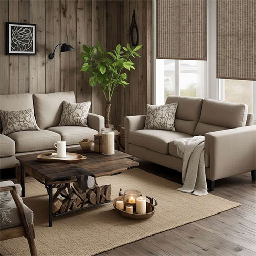 הבדים האיכותיים העשויים פוליאסטר מעניקים שילוב מושלם של פונקציונליות מעשית ואסתטיקה טבעית מרהיבה. הסגנון מתאפין בגוונים רכים וטבעיים, בשילוב טקסטורות מיוחדות הדומות לעץ, ראטן וקש, יחד עם חבלים וטקסטיל רך הנעים למגע.